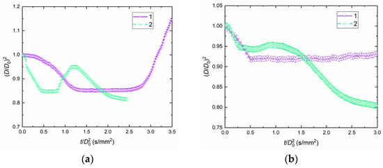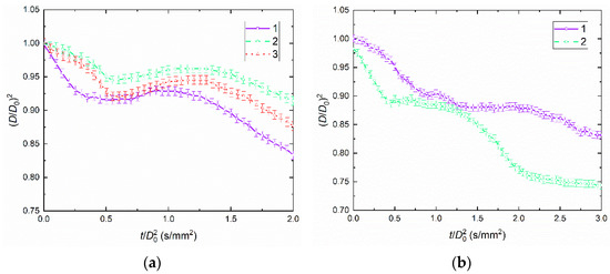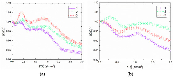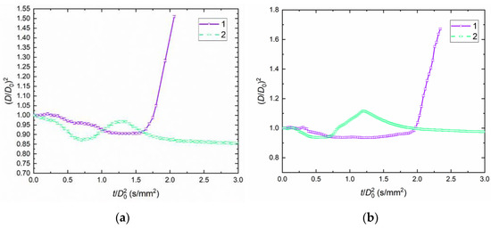 Figure 5a presents the temporal characteristics of droplet evaporation and drying until breakup for blend K50W49R1. The duration of droplet swelling (initial size increase) did not exceed 2 s, the time of water vapor filling the pores was up to 7 s until the subsequent size increase began, and the droplet size decreases until full moisture evaporation took up to 15 s. The maximum value of (D/D0)2 ≈ 1.025 was recorded at Ta ≈ 1050 K. Figure 5b presents the data for blend K50W49LE1. In contrast with Figure 4, Figure 5b shows the consecutive stages of water vapor filling the pores and droplets growing in size due to an increase in the pressure inside the pores filled with water vapor, without the initial droplet size growth, throughout temperature range from 950 to 1150 K. Then, we observe a decrease in the droplet size by up to (D/D0)2 ≈ 0.65–0.75 until all the moisture evaporates. The duration of water vapor filling the pores was up to 12 s until the subsequent size increase began, and the droplet size decreases until full moisture evaporation took up to 8 s. The maximum value of (D/D0)2 ≈ 1 was observed at the initial moment at all ambient gas temperatures.