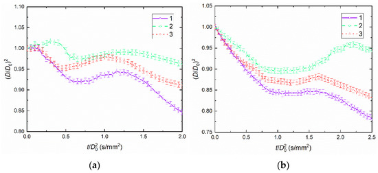Temporal characteristics of droplet evaporation and drying until breakup for blends K50W49LI1 (a) and K50W49D1 (b) (Rd0 = 1.3 ± 0.1 mm): 1—Ta = 950 ± 30 K; 2—Ta = 1050 ± 30 K; 3—Ta = 1150 ± 30 K.