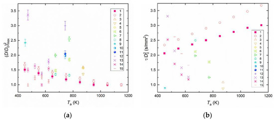Generalized experimental data on maximum values of (D/D0)2 (a) and τ/(D0)2 (b) vs. gas temperature for different fuel compositions in the course of breakup: 1—C50W49D1 (current study); 2—C50W49R1 (current study); 3—diesel [52]; 4—DCe-0.05 [52]; 5—DCe-0.25 [52]; 6—P25BD75 [53]; 7—P50BD50 [53]; 8—P75BD25 [53]; 9—HE30 [54]; 10—E10 [55]; 11—E30 [55]; 12—E50 [55]; 13—water/kerosene [56]; 14—water/diesel [56]; 15—water/rapeseed oil [56].