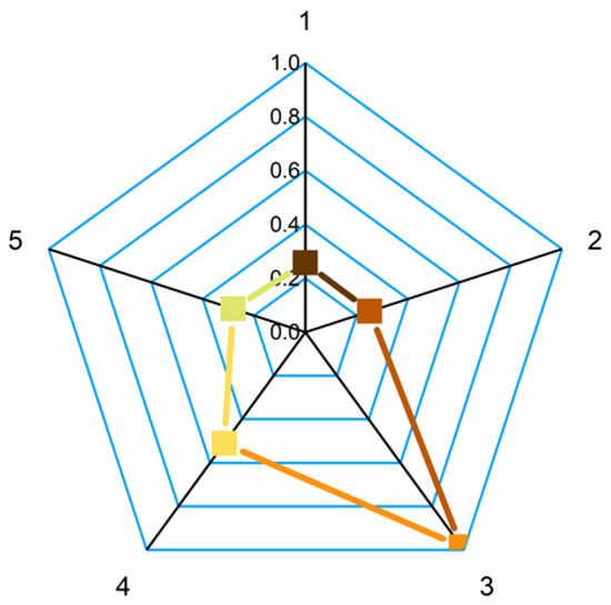 Diagram of relative efficiency indicators for time, maximum values of (D/D0)2max, and critical breakup temperature for the following compositions: 1—C50W49D1; 2—C50W49R1; 3—water/kerosene [56]; 4—water/diesel [56]; 5—water/rapeseed oil [56].