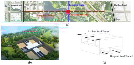 Location and structural diagram of the crossing section of Huayuan Road and Luzhou Road: (a) plane layout, (b) three-dimensional location diagram of crossing section and (c) structural frame diagram of crossing section.