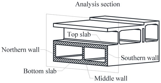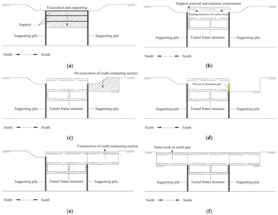 Based on the construction process of the connecting section (see Figure 3), it can be seen that an asymmetric construction measure was adopted in the engineering, since the soil excavation of the foundation pit in the southern part was conducted prior to the soil excavation in the northern part. Large structure deformation and soil settlement might occur because of a sudden stress release and an unevenly distributed loading during asymmetric construction [,]. The asymmetric construction measure might result in a structural deflection and subsequently affect the function of the tunnel structure.