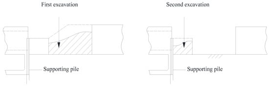 The tunnel frame structure of Huayuan Road was constructed prior to that of Luzhou Road (see Figure 3). Consequently, the mechanical behavior of the tunnel frame structure of Huayuan Road was greatly affected by the construction of Luzhou Road as it approached the crossing section. In engineering the crossing point, the construction process of such a long tunnel was carried out from one section to another (about 25 m in length per section), and the section next to the Huayuan Road foundation pit was regarded as a connecting section that served as a connection of the Huayuan Road Tunnel and Luzhou Road Tunnel. The deformation behavior of the crossing section is a main issue for engineering the construction. In order to study the influence of the construction process on the deformation behavior of the connecting section, the whole construction process was divided into six procedures, as shown in Figure 3. Firstly, the pit of Huayuan Road around the crossing section was excavated and supported by a series of cast-in-place piles and three-row transverse support. Secondly, the tunnel frame structure of the crossing section was constructed from the bottom to the top (Huayuan Road downward sides and Luzhou Road upward sides). Thirdly, the southern pit of the connecting section was excavated in the Huayuan Road Tunnel, and the soil behind the supporting pile was removed in two steps according to the construction scheme (as shown in Figure 4). Fourthly, the part of the supporting pile above the pit bottom was cut off. Fifthly, the upper tunnel frame structure of the connecting section (tunnel frame structure of Luzhou Road) was constructed. Finally, the tunnel frame structure of the connecting section at the northern part was constructed the same way as the southern part.