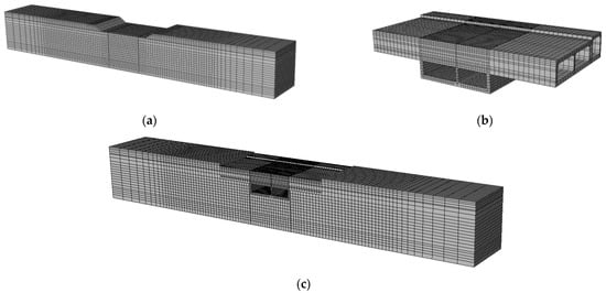Numerical model of tunnel frame structure of Huayuan Road: (a) solid model; (b) tunnel model; (c) entire model.