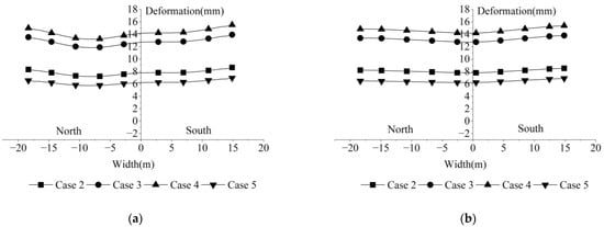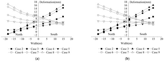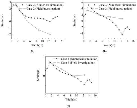 In order to verify the effectiveness of numerical simulation, the numerical results of the axial strain of the top slab were compared with those observed in the field investigation of several cases (Cases 2–4) in asymmetrical construction, as shown in Figure 6. The numerical simulation captured the basic changing regulation of the axial strain of the top slab, and it showed a decreasing tendency along its width. Meanwhile, the value of axial strain in numerical simulation is quite close to that in field investigation. Consequently, it is regarded that the results determined by numerical simulation are consistent with those obtained by field investigation.