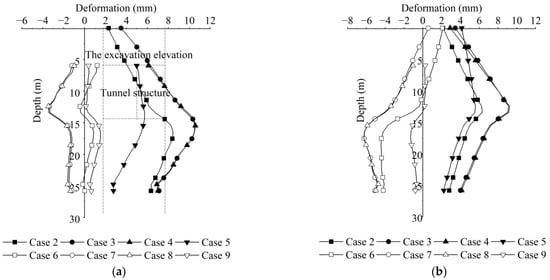Lateral deformation of supporting pile by asymmetric construction method: (a) southern pile and (b) northern pile (unit: mm).