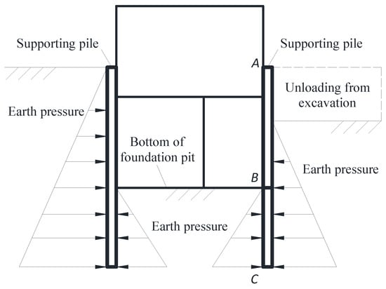 The above deformation behavior is related to the mechanical characteristics of the supporting pile (see Figure 8). The supporting pile is divided into two parts by taking the bottom line of the foundation pit as the interface, known as Section AB and Section BC. As for Section AB, the deformation behavior of the supporting pile is dependent on the loading cases. The supporting pile tends to move towards the direction away from foundation pit when the soil behind supporting pile is excavated. The construction of the tunnel frame structure on the other side will also cause the supporting pile to move away from the foundation pit. There is an uneven stress of the whole system, and the supporting pile is affected by earth pressure from the left side. As for the Section BC, the supporting pile tends to move towards the right during the whole construction period (see Figure 8), since there is a constraint at Section AB due to the tunnel frame structure. Section BC is extruded by the soil near the connection section due to the self-weight of the tunnel frame structure, as well as an unloading induced by soil excavation on the other side. The distribution of force greatly influences the deformation behavior of the supporting pile.