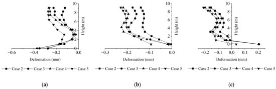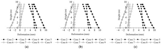 Lateral deformation of structural wall subjected to asymmetric construction: (a) northern wall, (b) middle wall and (c) southern wall (unit: mm).