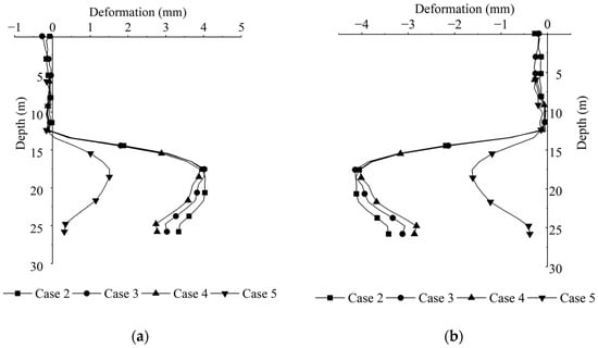 Lateral deformation of supporting pile subjected to symmetric construction: (a) southern pile and (b) northern pile (unit: mm).