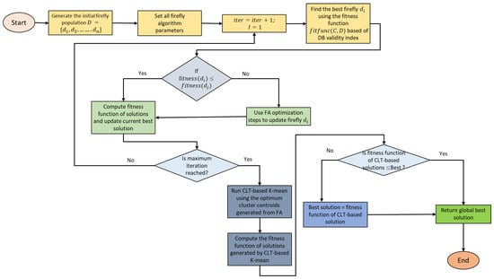 The rest of the paper is outlined as follows: Section 2 presents the related works on FA-based K-means hybrid algorithms. Section 3 describes the classical firefly algorithm, K-means algorithms, the central limit theorem, and its application in the design of a scalable K-means algorithm. It also describes the proposed improved FA-based K-means hybrid algorithm. Section 4 presents the evaluation of the hybrid algorithm on high-dimensional datasets and comparison with other metaheuristic algorithms from the literature. The conclusion and future research direction are presented in Section 5.