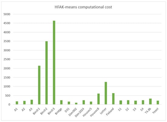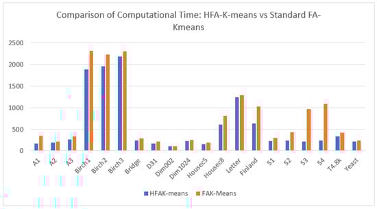 The computation results shown in Table 5 show that the proposed HFA-K-means can cluster high-dimensional datasets efficiently. The high convergence rate of the HFA-K-means is reflected in Figure 2, showing the average computation time required to achieve convergence. In comparison with the classical FA and K-means algorithms, as shown in Table 4, the proposed HFA-K-means recorded the best performance in 16 of the 20 datasets, namely, A1, A2, Birch1, Birch2, Birch3, Bridge, D31, DIM1024, Housec5, Housec8, Finland, S1, S2, S3, S4, and T4.8k. HFA-K-means recorded ties with FA in the remaining ones, namely A3, DIM002, Letter, and Yeast. In terms of average performance across all the 20 datasets, the HFA-K-means recorded the lowest value, followed by the FA. The lesser values of HFA-K-means compared with FA and K-means in most datasets show better performance. Based on this, we can infer that HFA-K-means can effectively and efficiently automatically cluster high-dimensional datasets.