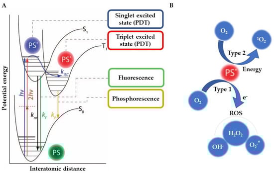 Perrin–Jablonski energy diagram for a photosensitizer (PS). (A) The absorption of a photon (hν) leads to electronic excitation to singlet (S1) or triplet (T1) states. In the singlet state, the photosensitizer can react with neighboring molecules, or transition to the triplet excited state, T1, by intersystem crossing (ISC), or relax, S0, with energy dissipation (nr). (B) Type 1 and 2 reactions. The triplet state is the longest-lived state; hence it mediates the biological and photochemical reactions that lead to the production of radical species through the transfer of electrons to oxygen or other electron-accepting cell substrates, type 1 reaction, or the transfer of energy for oxygen molecules with formation of singlet oxygen (1O2), type 2 reaction. The 1O2-mediated photodynamic mechanism is the most important for PDT-induced cytotoxicity.