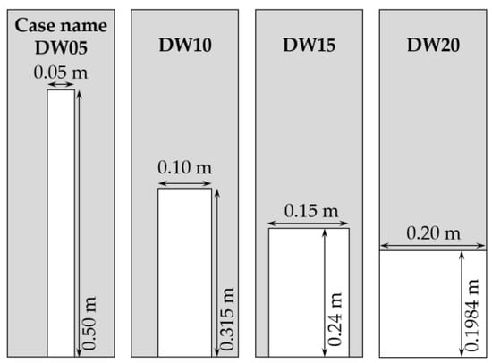 where and mean the area and height of the opening. The ventilation factor of the openings in Figure 2 based on equation (2) is 0.0092 kg/s, which is the same for all. However, according to previous studies [26,27], the ventilation factor needed to derive GER may differ from the theoretical value depending on the opening shape. Because of this, correlations [21] that do not take into account the effect of opening shape may have uncertainty. Therefore, the effect of changes in the opening shape with a fixed ventilation factor on fire characteristics should be investigated. As shown in Figure 2, openings of various shapes designed to have a constant ventilation factor were used in the experiment. The opening shapes were designed to more easily implement a wide range of GER values, including the range where abnormal behavior occurs ( ≈ 0.6~1.2). The opening width (door width, DW) was changed to 0.10 m, 0.15 m and 0.20 m based on DW05, and the height (h) was changed to keep the ventilation factor constant. The name of each opening was determined by its width.