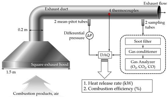 Figure 3 presents a schematic diagram of the lab-scale calorimeter (LSC) [28] based on the oxygen consumption method [29,30] used to measure HRR and combustion efficiency. A square hood with a side length of 1.5 m captures combustion products and surrounding air and exhausts them through an exhaust duct (D = 0.20 m). Part of the flow passing through the exhaust duct is sampled through two porous tubes. After undergoing a pre-process to remove soot and moisture, the sampled gas is introduced into the gas analyzer (OXYMAT 61, ULTRAMAT 23). In addition to these measurements, the HRR is calculated through the additional consideration of the mass flow rate and the average cross-sectional temperature in the exhaust duct.