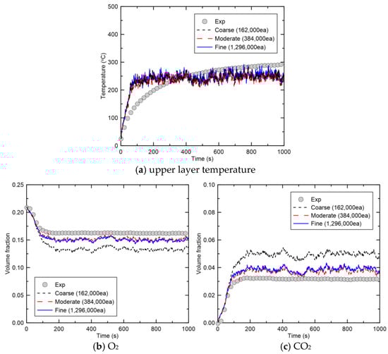 Figure 4 shows the grid sensitivity analysis results. In Figure 4a, in the process of increasing the temperature, the temperature measured in the experiment rises more slowly than the predicted temperature; this difference is attributed to the shape, diameter, and direction of the beads. However, the predicted and measured temperatures in the steady state, the focus of this study, exhibited similar trends. The temperatures predicted according to grid size showed the same values over all sections, indicating that the grid sensitivity to temperature was not large. In contrast, in Figure 4b, the decrease in O2 was overestimated for the coarse condition, unlike moderate and fine. Moreover, a comparison with the experimental measurements indicated relatively large errors for coarse. In Figure 4c as well, the CO2 volume fraction was overestimated for coarse compared with moderate and fine, with large errors in the measured values. A grid sensitivity analysis is the process of finding the conditions in which the grid size does not impact the numerical analysis results. Taking this into account, the coarse condition was not suitable to use in this study because the predicted values changed depending on the grid size and also showed a relatively large error. Considering the costs (computational resources, time) required for the numerical analysis, it was efficient to use the moderate condition. However, at higher GER conditions, the reduction in the resolution of the opening flow can cause errors in the numerical analysis results [36]. Taking this into account, the fine condition where as many grids as possible can be inserted in the opening area was used for the numerical analysis.