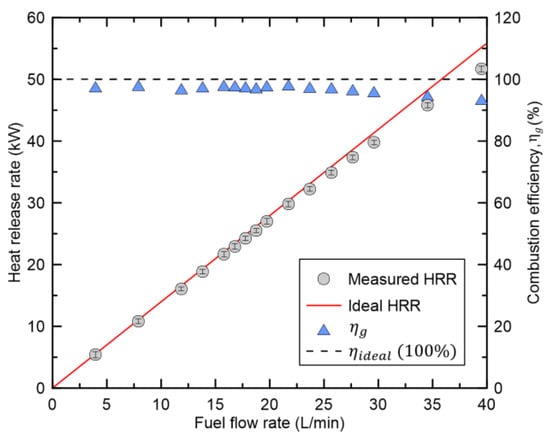 Table 2 provides a summary of the experimental conditions considered in this study and the fuel flow rate to implement each GER. At room temperature (25 °C), the ideal HRR considering fuel density (1.808 kg/m3) and heat of combustion (46,400 kJ/kg) [31] ranges from 5.5 to 55.2 kW. Experiments for each GER were carried out for 600 to 1200 s, in which the measured HRR, temperature, incident heat flux, and species concentration reached a steady state and were sufficiently maintained. Changes in fire phenomena according to GER and opening shape were analyzed by comparing the averages at 100 s in the steady state, and the standard deviations in the form of vertical error bars were also presented.