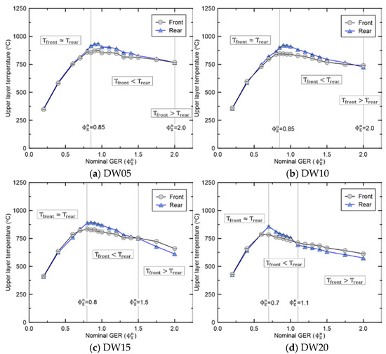 To investigate the internal environment according to flame behavior, Figure 7 shows a comparison of the average ULT according to nominal GER. The front and rear temperatures were measured via thermocouples installed at a height of 0.55 m from the compartment floor. When the fire source is located at the center of the compartment, the internal thermal environment undergoes the following changes as the fire grows. At a very low GER condition, the flame forms in the vertical direction of the fire source, and the front and rear temperatures do not greatly differ. As the fuel flow rate (i.e., GER) increases, the mass of combustion products and air entering and exiting the compartment also increases. At this time, the increased flow rate of the inlet causes the flame to move to the rear of the compartment, thus increasing the temperature at the rear. As GER further increases, the oxygen inside the compartment is depleted, and the flame moves to the front. In this process, the front and rear temperatures become reversed, and the front exhibits a higher temperature. From this perspective, examining the experimental results of DW05 in Figure 7a, the front and rear temperatures in the range of = 0.2 to 0.8 do not show a large difference (). However, at = 0.85, it shows a relatively high temperature at the rear side (). At =2.0, the temperature difference between the front and rear decreases due to the forward movement of the flame, and at a higher , the front will show a higher temperature (). The experimental results of the other openings in Figure 7b–d also exhibit similar behavior. However, the timing at which the relationship between the temperatures measured at the front and rear changes varies depending on the shape of the opening. The experimental results of DW10 in Figure 7b do not greatly differ from DW05. On the other hand, in the experiment of DW15, the rear temperature showed a higher value at = 0.8, and the temperatures were reversed at = 1.5. This trend is intensified in the DW20 experiment. Specifically, the rear temperature is higher than under the condition of = 0.7, and the temperature reversal is observed under the condition of = 1.1.
