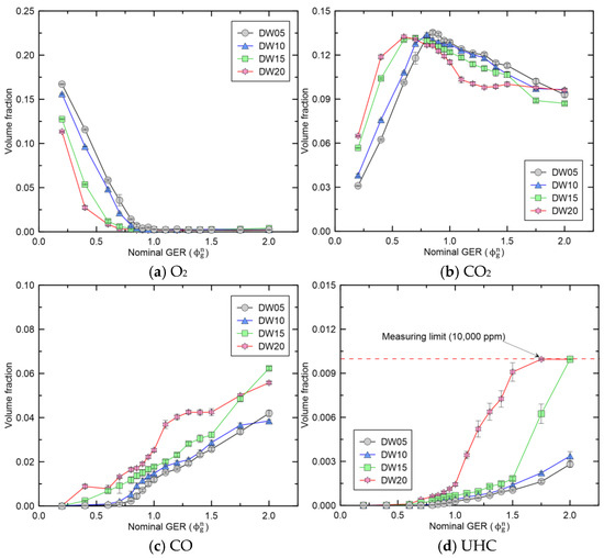 Figure 8 compares the average volume fractions of species measured in the upper layer according to the nominal GER under various opening shape conditions. Under the same nominal GER conditions, the volume fraction of O2 decreases with decreasing opening height in Figure 8a. Conversely, CO2 exhibits a higher volume fraction as the height of the opening decreases. Through this, it can be seen that the change in the opening shape affects the chemical environment inside the compartment under the same fuel flow condition. As a result of examining CO volume fraction (Figure 8c), under the same fuel supply condition, the lower the opening height, the higher the value, and the UHC also exhibits the same behavior with CO. In particular, the volume fraction of UHC exceeded the measurement limit under some conditions during the experiments on DW15 and DW20, which have relatively low heights. Considering that CO and UHC are incomplete combustion materials, these results mean that the lower the opening height, the more inefficient combustion occurs under the same fuel supply condition. Changes in the chemical environment according to the opening shape can lead to changes in the overall characteristics of the compartment fires. Therefore, the cause of the change in chemical environment according to the shape of the opening should be examined.