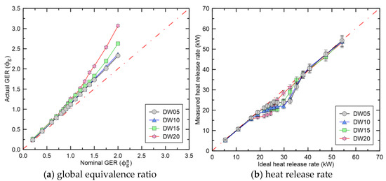 In order to examine the effect of the difference in air inflow rate on the fire phenomenon, Figure 10 compares the GER and average HRR according to the opening shape under the same fuel flow condition. In Figure 10a, the actual GER () based on the air inflow rate predicted through FDS is presented as a function of the nominal GER (). As a result of the comparison, the actual GER, considering the air inflow rate according to the opening shape has a higher value than intended under all experimental conditions. Under identical fuel flow rates, actual GER increased as the opening height decreased. In particular, it was confirmed that DW20 had an actual GER exceeding 3.0 under the condition of fuel flow rate corresponding to =2.0. This difference is closely related to the change in the fire phenomenon according to the opening shape observed in Figure 6, Figure 7 and Figure 8. Under the same fuel supply condition, a relatively high actual GER can have a very large effect on fire characteristics. Specifically, as confirmed in Figure 6, it causes an increase in the ejected flame volume and also brings a large change to the temperature distribution and chemical environment inside the compartment, as shown in Figure 7 and Figure 8. Accordingly, actual GER () considering air inflow rate for each opening shape, was used in the following analysis of fire phenomena. Figure 10b presents the average HRR in the steady state as a function of the ideal HRR. As shown in the figure, under the condition of a low ideal HRR (<20 kW), HRR does not greatly differ from the ideal HRR regardless of the opening shape. However, average HRRs in specific sections were considerably lower than the ideal HRR despite the increase in fuel flow rate. This phenomenon occurs earlier as the opening height decreases. This abnormal behavior occurs when the ideal HRR is 20–35 kW and is attributed to incomplete combustion before flame ejection as mentioned earlier.