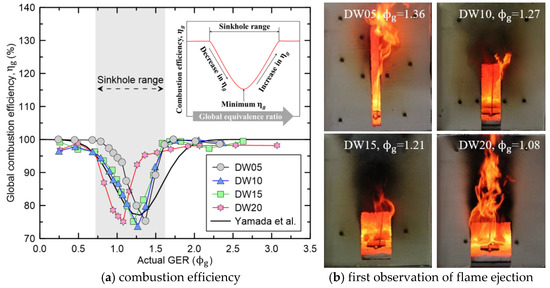 Figure 11 shows the detailed analysis results of abnormal behavior according to the experimental conditions. In Figure 11a, the combustion efficiency is presented as a function of actual GER, and the combustion efficiency predicted based on the correlation proposed by Yamada et al. [21] is shown together. This study refers to the abnormal behavior of combustion efficiency caused by incomplete combustion before flame ejection as the “sinkhole phenomenon.” The sinkhole phenomenon can be explained with the additional figure inserted at the top of Figure 11a. The combustion efficiency of the compartment fire under low GER conditions does not show a significant difference from that of the open environment, but the combustion efficiency begins to decrease as the GER increases. However, this decreasing trend does not continue. When GER is further increased, the sinkhole phenomenon ends, and combustion efficiency increases again. Considering this process, looking at the compartment fire experiment, the combustion efficiencies in the range of = 0.2~0.6 show a value close to 100% regardless of the opening shape. However, the combustion efficiency starts to decrease around = 0.6 and reaches a minimum of about 70%. The combustion efficiencies were compared based on the actual GER, in which the change in air inflow rate according to the opening shape was taken into account. Nevertheless, differences according to the opening shape were observed in the condition () at which the decrease in combustion efficiency starts and the condition () showing the lowest value. Because of this, the correlation [21] does not seem to adequately reflect the shifting of the sinkhole phenomenon along the actual GER axis according to the opening shape. These differences can be attributed to the change in the height of the neutral plane according to the opening height and the change in fuel and air mixing time due to the corresponding change in air inflow path. Therefore, the influence of these factors should be further examined to specify when the sinkhole phenomenon occurs. After showing the lowest value, the combustion efficiencies increase rapidly to reach close to 100%. The increase in combustion efficiency is achieved at the same time as the flame is ejected through the opening. Figure 11b presents actual GER () at the time when the flame is first observed outside the compartment and a photo of the flame. In Figure 11a, the combustion efficiency of DW05 begins to increase at the condition with = 1.36, at which point flame ejection is first observed. The same phenomenon is observed in the conditions of DW10, DW15 and DW20. From these results, it can be seen that the sinkhole phenomenon has a close relationship with the flame ejection through the opening. In order to understand the relationship between flame ejection and the sinkhole phenomenon, an analysis of the opening exhaust flow according to the actual GER was performed.