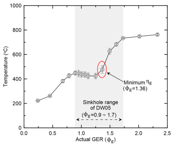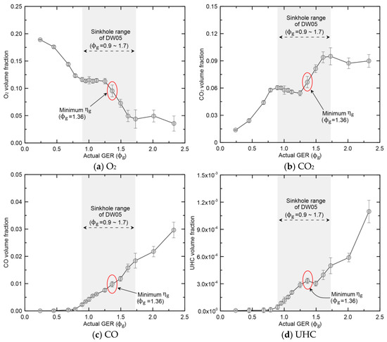 Figure 12 presents the measurement results of the average temperature of the discharge flow through the opening. The temperature of the discharge flow was measured through experiments on DW05, and the measurement results were presented as a function of the actual GER. The location of thermocouples (TC, TR and TL) for temperature measurement is shown in Figure 1. The three thermocouples are useful for considering the temperature deviation in the width direction of the opening. Figure 12 shows the average value and standard deviation for the three measurements. In the conditions before the sinkhole phenomenon occurs, the temperature of the discharge flow increases with GER. This behavior is the same as the result of a study [19] showing that the temperature of the fire flow field increases with GER in the over-ventilated fire condition. However, in the region where the sinkhole phenomenon occurs (shaded region), the temperature of the discharge flow shows abnormal behavior. In the section where the combustion efficiency decreases ( = 0.9~1.36), the temperature of the discharge flow does not change significantly despite the increase in the fuel flow rate. Through this, it can be seen that the amount of heat released inside the compartment is limited for some reason, and some of the supplied fuel is not burned. After that, starting with the condition of = 1.36 where the flame was ejected out of the compartment, the temperature of the discharge flow increased. Because the temperature inside the compartment decreased under the same conditions (Figure 7a), the temperature increase of the discharge flow is attributed to contact between the ejection flame and the thermocouple beads. To verify whether some fuel was not burned in the section where the temperature of the discharge flow did not increase, the chemical composition of the discharge flow was analyzed.