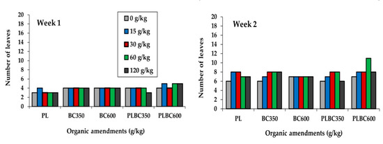 From week 1 to week 6, the statistical analysis results revealed that the average number of leaves increased significantly with the application rate in both treatments (Figure 4). All treatments produced significantly higher number of leaves than the control plants. Plants grown in soil treated with PL, BC350, and PLBC600 showed a statistical difference (p < 0.05) from week 2 to week 6; however, no statistical difference (p > 0.05) was observed for any of the treatments during week 1. Plants grown in PLBC600 soil had the most leaves (18), followed by PL (14), BC350 (13), and PLBC350 (12) (Figure 4).
