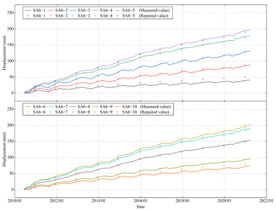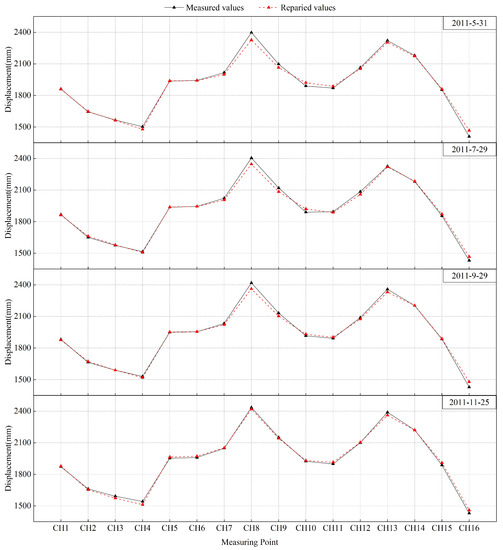 Comparison between measured value and repaired value of vertical deformation measuring points.