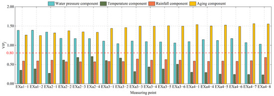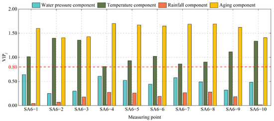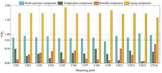 The variable importance for the projection method was used to identify the influence factors of effect variables at each measuring point. It was found that the important influence factors at each measuring point were consistent. The effects of aging and water pressure were more remarkable, with the VIPj values being all greater than 1, while the effects of temperature and rainfall were relatively small, with the VIPj values being basically between 0.4 and 0.6, as shown in Figure 8.