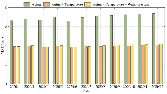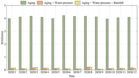 As above, the spatial cokriging models of aging single-factor, aging water pressure two-factor, and aging water pressure rainfall three-factor were constructed by using the measured values of each measuring point. The single-point error analysis was conducted for the measured values on 11 June 2020, as shown in Table 2. The overall error analysis was conducted for the measured values from January 2020 to December 2020, as shown in Figure 9. It could be seen that the maximum relative error appeared at EXa3-4, which was analyzed to be caused by the small measured value. The analysis combined interpolation and extrapolation and found that although measuring points such as EXa1-1 and EXa4-1 were marginal points, there were more intact measuring points around them, so the extrapolation of the two-dimensional model was better than that of the one-dimensional model. According to the single measurement point error analysis, the accuracy of the two-factor cokriging model is significantly improved compared to the accuracy of the single-factor cokriging model, which is difficult to ignore, and the absolute error of each measurement point was reduced by more than 80%. The accuracy of the three-factor cokriging model is comparable to that of the two-factor cokriging model, the relative error reduction is not significant, and the accuracy of the two-factor cokriging model is slightly better than that of the three-factor cokriging model for the measuring points EXa2-1 and EXa3-1. The overall error analysis showed that the mean absolute error of the two-factor model (0.07~0.23 mm) was significantly lower than the mean absolute error of the one-factor model (3.95~4.22 mm), while the mean absolute error of the three-factor model (0.06~0.23 mm) was less different from that of the two-factor model. Thus, by analyzing the repair effects of introducing different covariates in the one-dimensional and two-dimensional models, the results obtained for both were consistent.