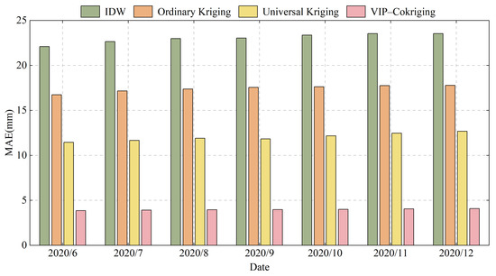 Overall, the VIP-cokriging model had the highest accuracy. The relative error of non-edge measuring points was mostly controlled within 3%, and the relative error of the edge measuring points was reduced compared with the other three models. Its mean absolute error was 3.85 to 4.08 mm, which was 83%, 77%, and 67% lower than that of the inverse distance weighting model, the ordinary kriging model, and the universal kriging model. The main reason was that cokriging introduced one or more auxiliary environmental variables that had a strong correlation with the effect variables, and using the cross-correlation between them could effectively improve the spatial expansion accuracy of the main variable at the unknown points, which could solve the problem of the insufficient number of measuring points.