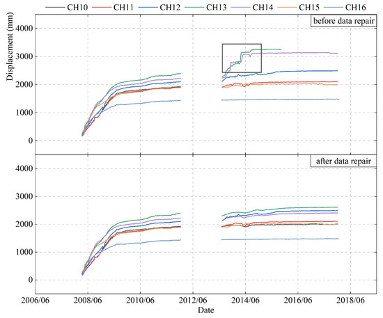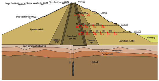 The PBG gravel soil earth core wall rockfill dam with a maximum height of 186 m was completed and stored in water for power generation in 2009. Its internal vertical displacement was monitored by the hydraulic overflow settlement gauge, and the measuring points of the typical profile (profile 0 + 240 m) were arranged, as shown in Figure 11. Due to the impact of temporary dam top removal and permanent dam top construction in 2012, there were many missing measurements between 2012 and 2013. Since completing the automation transformation in August 2013, the continuity of measured values was good. However, there were still some phenomena such as unstable measured values at some measuring points and blockage of instrument pipelines. For example, the CH10 and CH13 at the elevation of 725 m were damaged and measuring stopped in 2015. The stability of the CH14 measured value was poor, with an anomalous steep step from July 2013 to July 2014. At present, the measured value is close to the measuring range of the instrument, and the reliability of the measured value is poor, as shown in Figure 12.