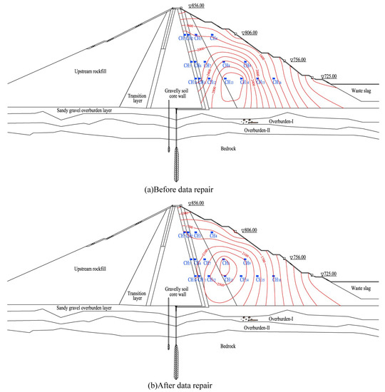 To control the overall distribution characteristics of vertical displacement at profile 0 + 240 m, the original monitoring data of all measuring points are used to draw an isoline map of settlement deformation at a typical high water level moment (12 October 2017), as shown in Figure 13a. It could be seen from the figure that the settlement deformation of the profile showed an increasing downward trend from the middle of the dam body, and the maximum settlement deformation occurred above the dam foundation. It was inconsistent with the law that the maximum settlement deformation of gravel soil core wall rockfill dam generally occurs in the area of 1/3~2/3 dam height. Analysis of the reasons should be related to the lack of measuring points at 731 m elevation and the unreliable measurement of CH14. To avoid misjudgment of dam operation behavior, a VIP-cokriging two-dimensional spatial model of internal vertical displacement at profile 0 + 240 m was constructed in this paper. The model was used to supplement the missing measured values of CH10 and CH13, and to repair the measured values of CH14.