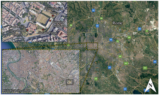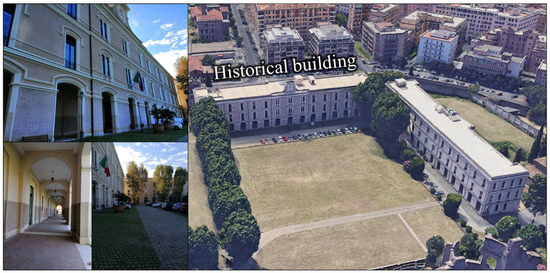 The building is located near the historical city centre of Rome at the location 41°53′19.0″ N 12°31′04.7″ E, placed at an altitude of 48 m above the sea level. The place is an important archaeological area; the buildings and ruins were built in the 3rd and 4th centuries AD. The relatively recent two buildings in the area, in which one of them is the object of the present study, were built in the beginning of the 1900s, and they were used as a military barracks. Aerial views of the construction are shown in Figure 1, while Figure 2 shows the 3D view and photography of the building.