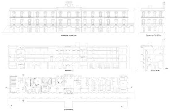 The historical building is approximately 27,031 m3 in volume, and an overall plant of about 7201 m2 is allocated on six levels, composed of three floors and three mezzanine floors that do not cover the plant of a normal floor (see Figure 3).