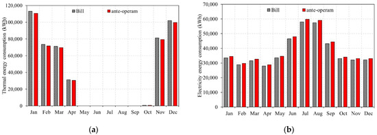 In the case study, a calibration with a discrepancy in the annual thermal and electricity consumption was achieved; they are, respectively, −2.2% and +3.0%. In particular, in Figure 4, the comparison of the bill and the ante-operam scenario that corresponds to the actual situation of the building is shown.