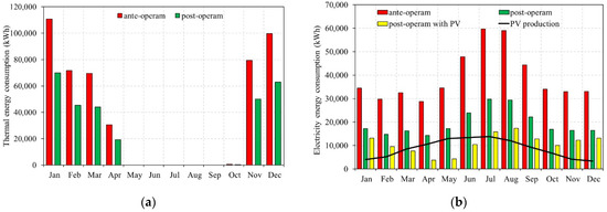 The post-operam scenario was conducted with all the energy efficiency strategies mentioned in Section 2.3. Figure 5 shows the comparison between the ante-operam and post-operam scenario. In particular, Figure 5b shows the post-operam scenario with and without the PV production.