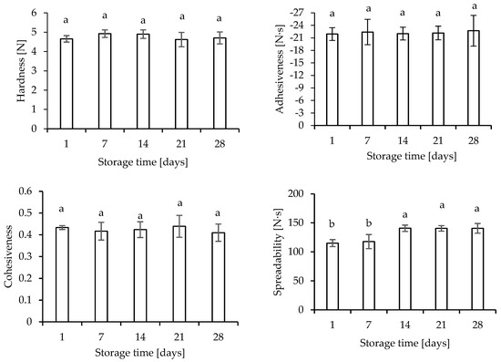 Four weeks of storage did not significantly affect most of the rheological and textural properties of the tested emulsions. Hardness, cohesiveness, and adhesiveness (Figure 1) did not change significantly (p ≤ 0.05). Only in the case of spreadability (Figure 1) was a slight increase in the obtained values noted. This was probably due to the way the samples were prepared and stored, as the emulsions were poured into the target containers as soon as they were obtained. While the containers for measuring hardness, adhesiveness, and cohesiveness were tightly closed with lids, in the case of spreadability, the female cones were only covered with aluminium foil and, despite being placed additionally in a sealed box, some of the water from the samples may have evaporated. This made the spreadability values with longer storage higher, which means the samples were more difficult to spread. Previous studies [19] concerning the effect of storage time on inulin–rapeseed oil emulsions also showed a lack of change in texture during storage. The presence of milk fat does not change the texture properties which is expected from the product designed for spreading on bread. The results obtained during textural analysis confirmed that the studied milk fat–inulin emulsion was easily spreadable immediately after being taken out of the refrigerator because the hardness values were similar to those recorded for soft margarines containing 20–40% fat, and spreadability values were similar to 40–60% fat margarines [22].