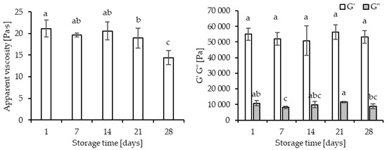 Rheological properties of the analysed samples showed that during storage milk fat–inulin emulsions were quite stable (Figure 2). No significant (p ≤ 0.05) differences were recorded for elastic (G’) modulus: however, some fluctuations of storage (G”) modulus were observed. A slight but significant decrease in apparent viscosity in the 4th week of storage was also recorded. In summary, we can suppose that there were no noticeable changes in the structure of the studied emulsion affecting the texture and rheological properties during storage, even though the probiotic bacteria were present in the matrix.