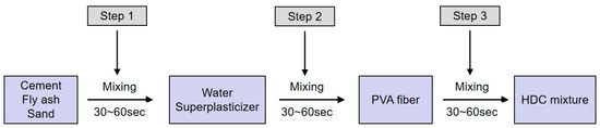 The target cubic compressive strength of the concrete was 50 MPa. Three test pieces were made for each mixture. The binding material was composed of cement and fly ash with a mass ratio of 1:1. The contrast mixture proportion had a fiber content of 0%, a water–binder ratio (mass ratio) of 0.29, and a sand–binder ratio of 0.36. To examine the influence of the age, water–binder ratio, and fiber–volume fraction on the flexural toughness and properties of HDC, 10 group specimens were made, as shown in Table 2. In the specimen ID, the number after the HC is the age, and the subsequent data represent the fiber content and the water-to-gel ratio. For example, HC56-1-29 means that the sample age was 56 d, the fiber volume content was 1%, and the water–binder ratio was 0.29. The mixing procedure is shown in Figure 2.