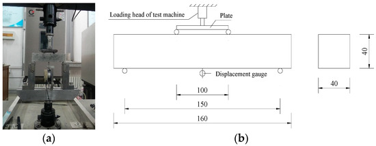 In this study, a beam specimen with a size of 40 mm × 40 mm × 160 mm was used for experimental research on the bending behavior of high-ductility fiber-reinforced concrete. The loading method was four-point loading, as shown in Figure 3. The loading rate was 0.18 mm/min, and the full load-deflection curve of the specimen was collected during loading and used for the bending toughness analysis. The loading device is shown in Figure 3.