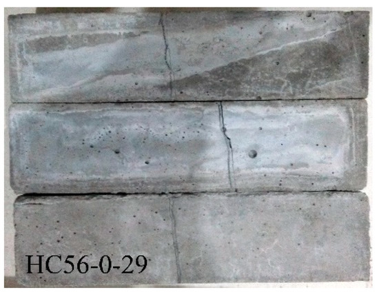 When the fiber content was 0%, the plain concrete specimens had brittle fractures along the initial cracks when they were loaded to the peak load (Figure 4). For the HDC beam, the deformation was very large and many fine cracks appeared, but the integrity was always maintained, indicating that the crack-break nature of the plain concrete specimen was essentially changed by the fiber addition (Figure 5). It could be concluded that HDC could not only improve the bearing capacity and deformation ability before failure, but could also make the failure clearly predictable, which is of great significance for engineering safety [36,37,38].