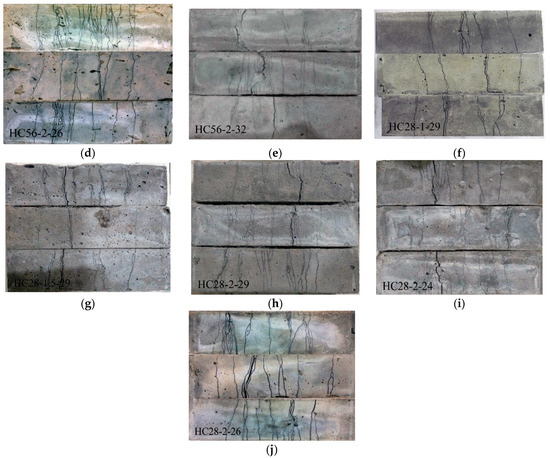 Failure pattern of the HDC specimens: (a) HC56-1-29; (b) HC56-1.5-29; (c) HC56-2-29; (d) HC56-2-26; (e) HC56-2-32; (f) HC28-1-29; (g) HC28-1.5-29; (h) HC28-2-29; (i) HC28-2-24; (j) HC28-2-26.