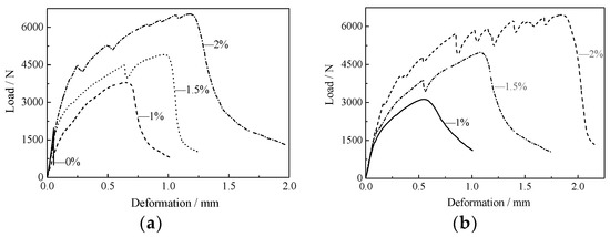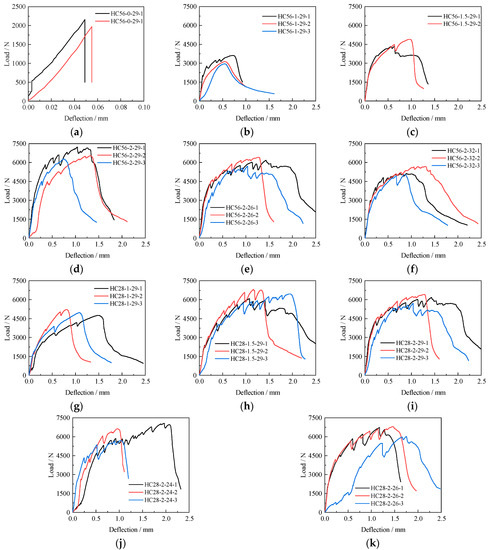 The load-deflection curve of the plain concrete specimen was linear. After reaching the peak load, it dropped to zero and the specimen suddenly broke down, as shown in Figure 6a. With an increase in the fiber content, the load-deflection curve of HDC (which was especially fuller in the rising section), the peak load, and its corresponding deflection also continued to increase, showing good toughness performance (Figure 6b–k).
