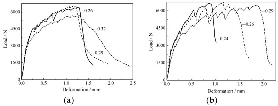 It can be seen from Figure 8 that with an increase in the water–binder ratio, the energy dissipation capacity of the HDC beam gradually increased, and the corresponding deflection range of its bending strength and peak load was about 10%. This was because the higher the water-to-gel ratio, the easier the fibers pulled out, which significantly increased energy consumption and deformation capacity [36]. In addition, the tensile strength of the fiber, the bond between the fiber and the matrix, and the strength of the matrix should also have a certain corresponding relationship to prevent the fiber from breaking, to ensure the pull-out failure of the fiber at the cross-section, and to enhance the tensile strain hardening effect of the material, as well as the multi-crack development characteristics.