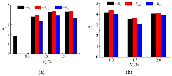 Effect of fiber content on Rn: (a) 56 d; (b) 28 d.