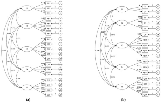 The pre-model was conducted for five latent variables and 19 observed variables. The pre-model is shown in Figure 3a, and the index fitting results are shown in Table 7. It can be seen from Table 7 that RMSEA and χ2/df of the pre-model do not match the standards, and all the indexes match the standards after deleting Q1 and Q7 with path coefficients less than 0.6. The revised after-model is shown in Figure 3b.
