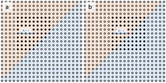 Schematic diagram showing node adjacency relationship. Pink and blue areas denote two different blocks; circles indicate grid nodes; black solid and open circles are the adjacent and non-adjacent nodes of the red nodes, respectively. is the adjacency radius ( is equal to 4 cells here). (a) shows the node adjacency relationship inside a block; (b) shows the node adjacency relationship at block boundary.