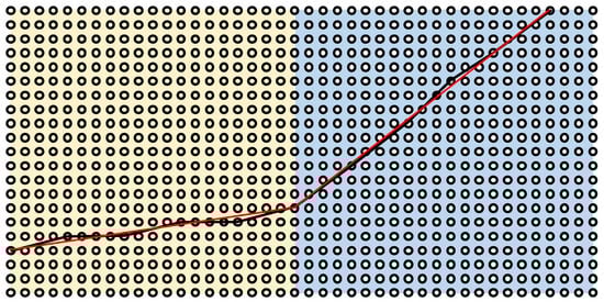 The attributes of a node are stored in 8 bytes (64 bits) in our program, whereas a block can be represented by 1 bit. This means that the number of blocks can be up to 64 in one model. As such, more bytes are required to store node attributes if larger complex structures with more than 64 blocks are used. In our program, two nodes are determined as adjacent nodes if the spacing in all directions of , and between the two nodes is less than or equal to the adjacency radius and non-zero is obtained after “and” operation is applied to corresponding elements of the attributes between the two nodes. By doing this, all rays passing through the block boundary will pass through one of the boundary nodes.