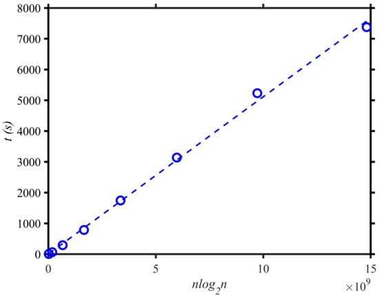 Our algorithm includes the calculation of the shortest path and the correction of ray path and travel time, which is difficult to estimate the time complexity. Thus, we evaluate the efficiency of the algorithm by using a laptop computer (CPU: Intel (R) Xeon (R) W-11,855M, 6 cores, basic frequency of 3.20 GHz) to calculate the travel time from one node (where one detector is located) to all other nodes. The adjacency radius is equal to 7 cells in all calculations. The time consumption and memory usage under different amounts of nodes are listed in Table 2. Memory usage is nearly proportional to the number of nodes. Figure 3 shows the approximate linear relationship between the time consumption and , where is the number of nodes.