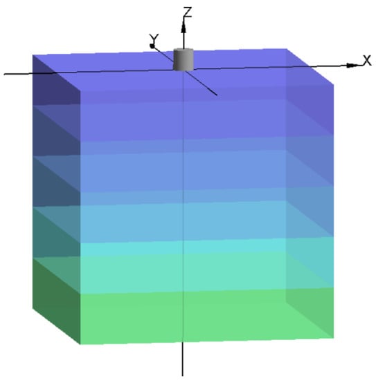 We build a test model, which is divided into five layers (five blocks). the thickness of each layer is 20 mm and the P-wave velocity from top to bottom layers is 3000 m/s, 3500 m/s, 4000 m/s, 4500 m/s, and 5000 m/s, respectively. The sensor is set in the center of the upper model surface (Figure 4).